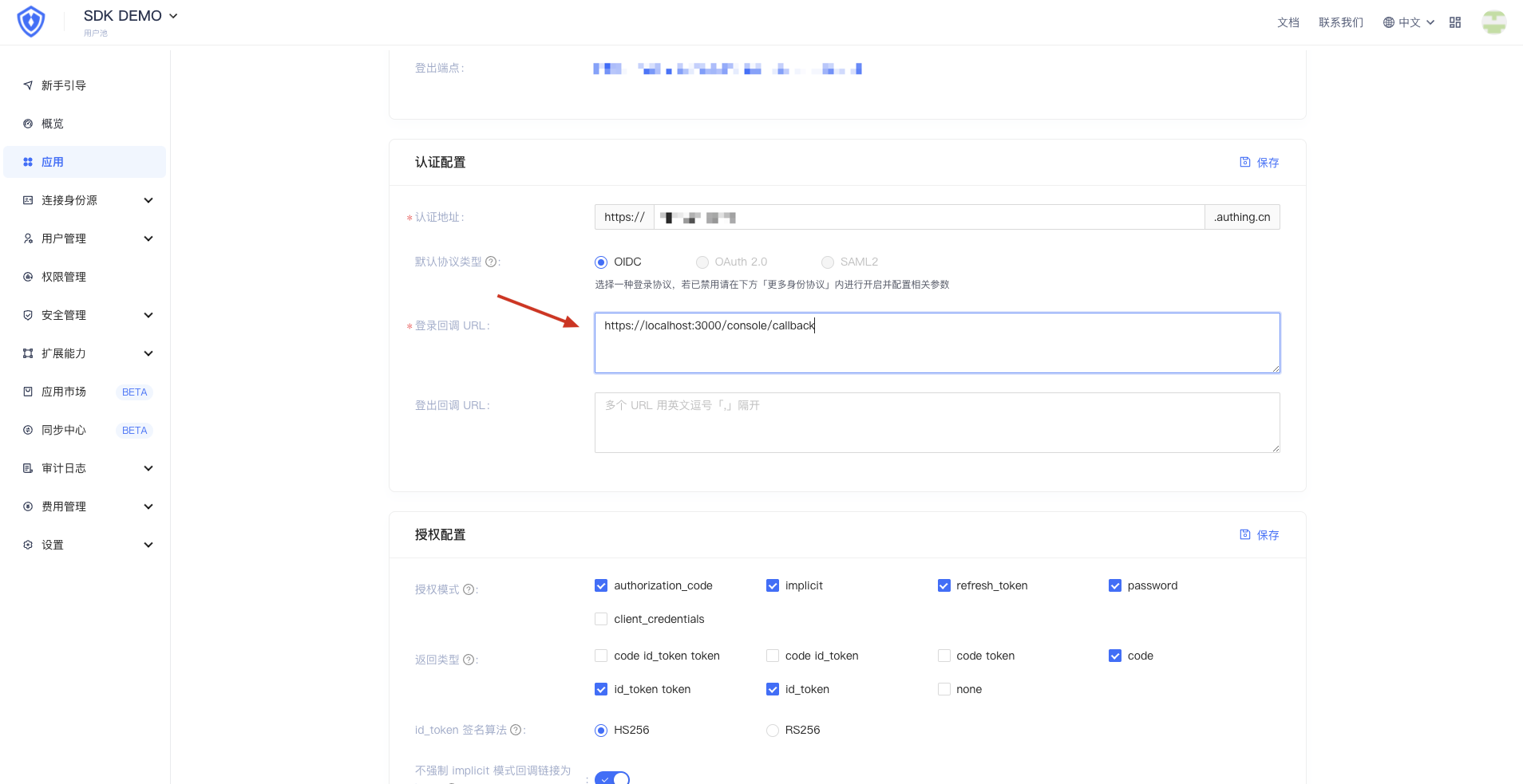 - Enter the app to find the authentication configuration, configure the login callback URL and save it