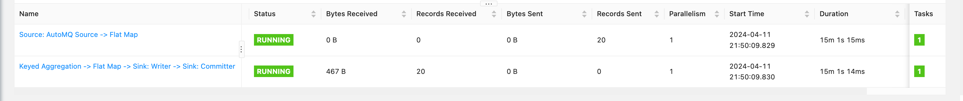 Execute the following command to submit the task jar to Flink, and monitor the console to see that 15 pieces of data have been received and processed.