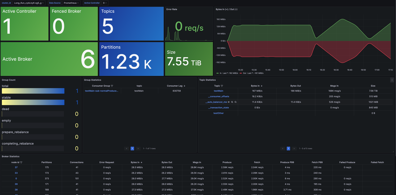 Cluster Overview: Provides cluster-level monitoring information, including metrics such as the number of nodes, data size, and cluster traffic. Additionally, it offers overview metrics for Topic, Group, Broker dimensions and supports drill-down capabilities for detailed monitoring data.
