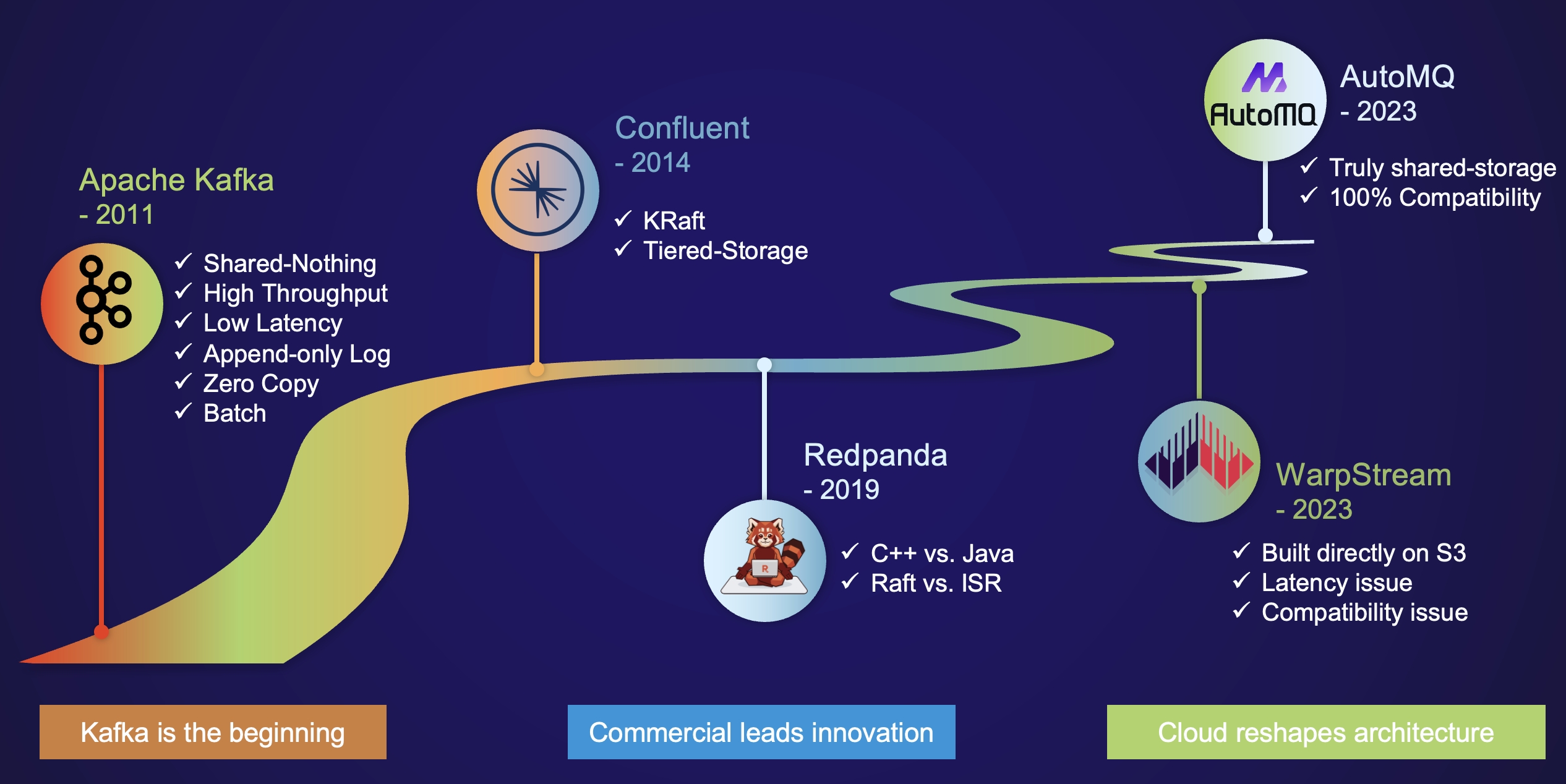 The advent of cloud-native technologies has further reshaped the stream storage industry. Over the past two years, two companies, WarpStream and AutoMQ, have made their mark by successfully implementing cloud-native Kafka, claiming an impressive tenfold reduction in cost.