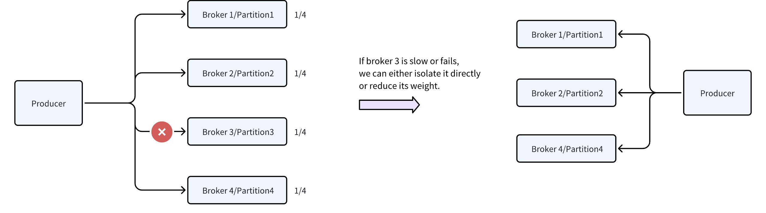 It's the easiest way to tolerate underlying service failures. As long as your cluster has sufficient capacity, it's no big deal if some nodes fail. On the client side, we use an adaptive partitioner to select healthy partitions or isolate brokers following the circuit breaker pattern.