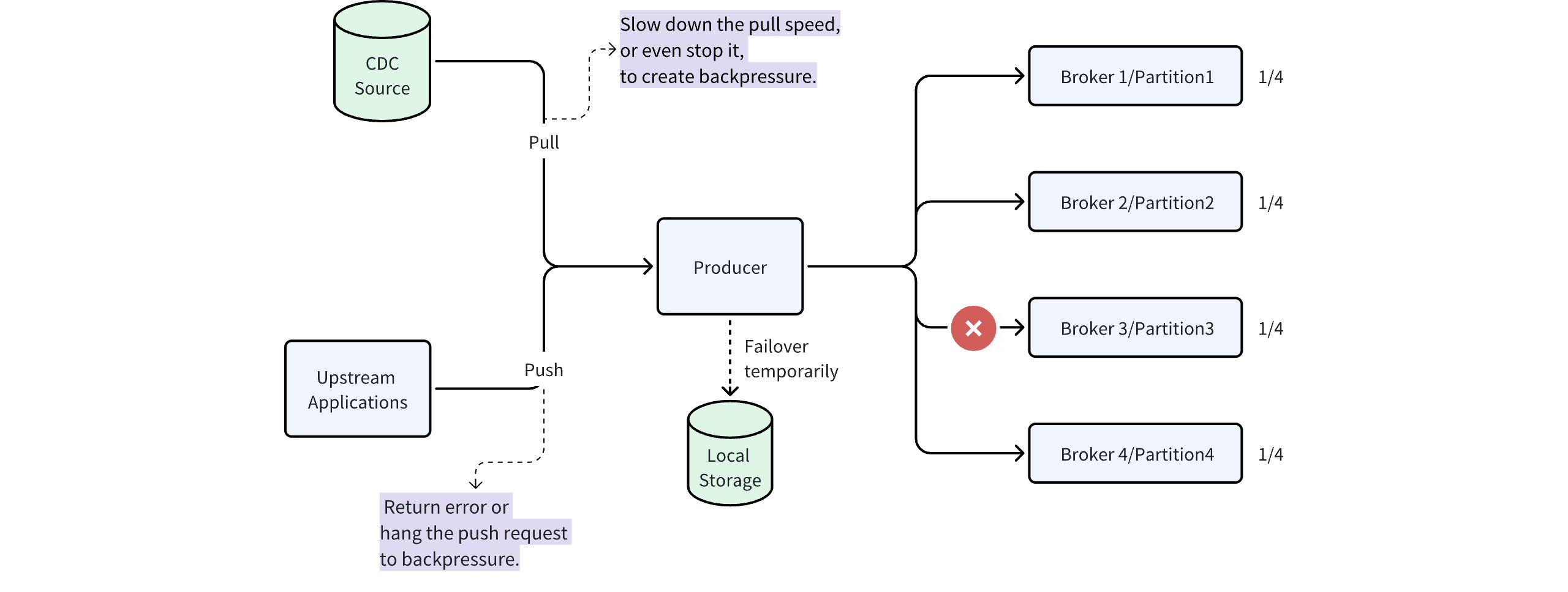 For producers, who may be the data sources, what if the Kafka service is down or slow to ingest data? Can we backpressure to the producer clients, causing them to stop pulling data from upstream sources like databases or to write new data to local devices as a failover mechanism?