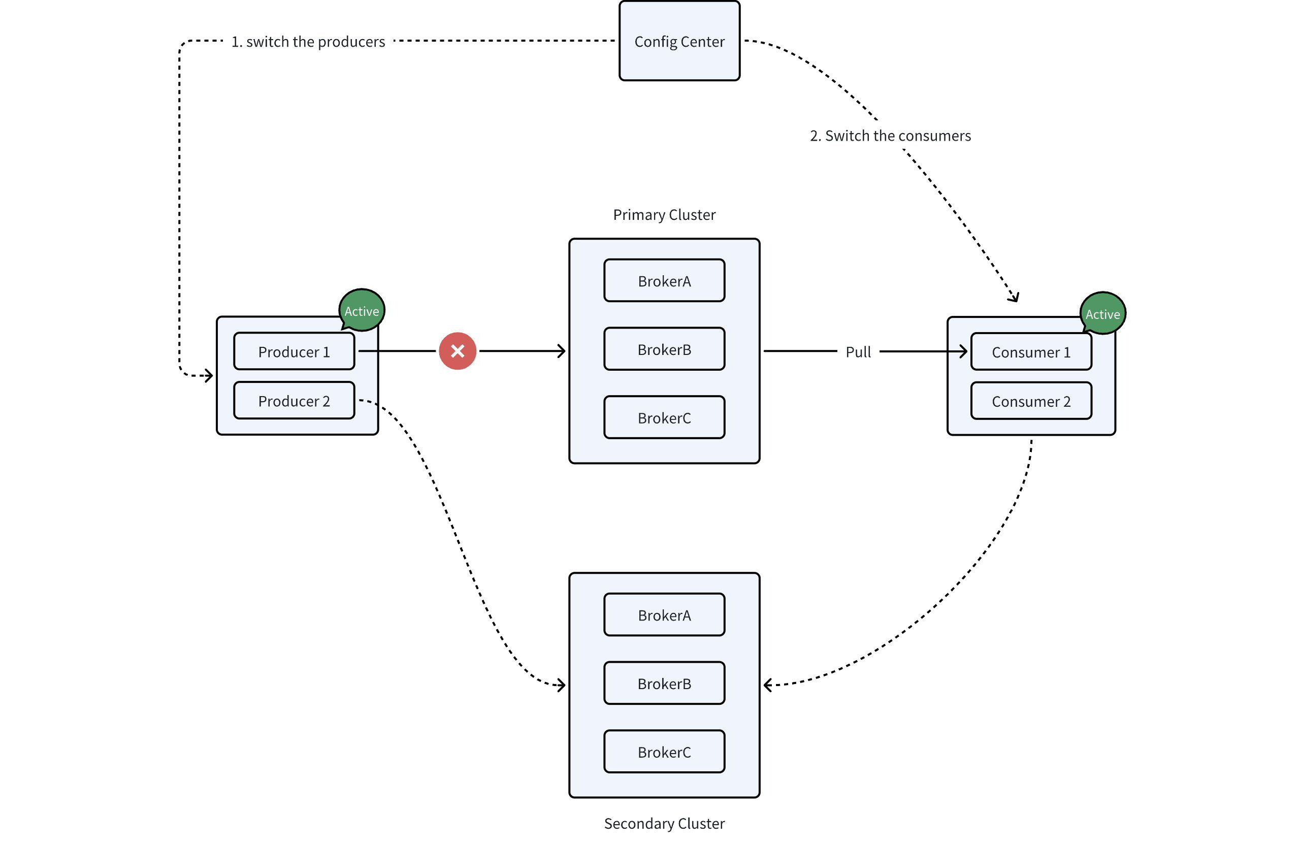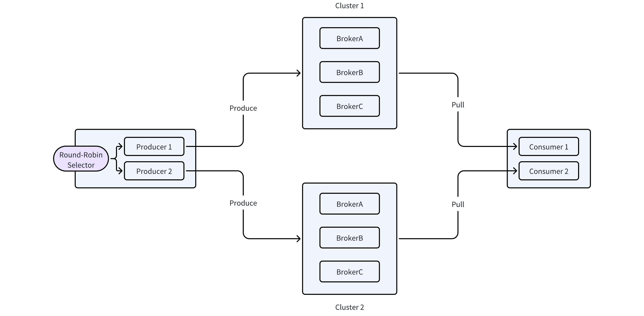 If you have two clusters and don't care about the ordering, it's easy to build a highly available architecture. Simply configure your clients with two producers and two consumers. The consumers will pull data from the two clusters, while the producers will write data to both clusters in a round-robin manner, isolating any failed cluster if necessary.