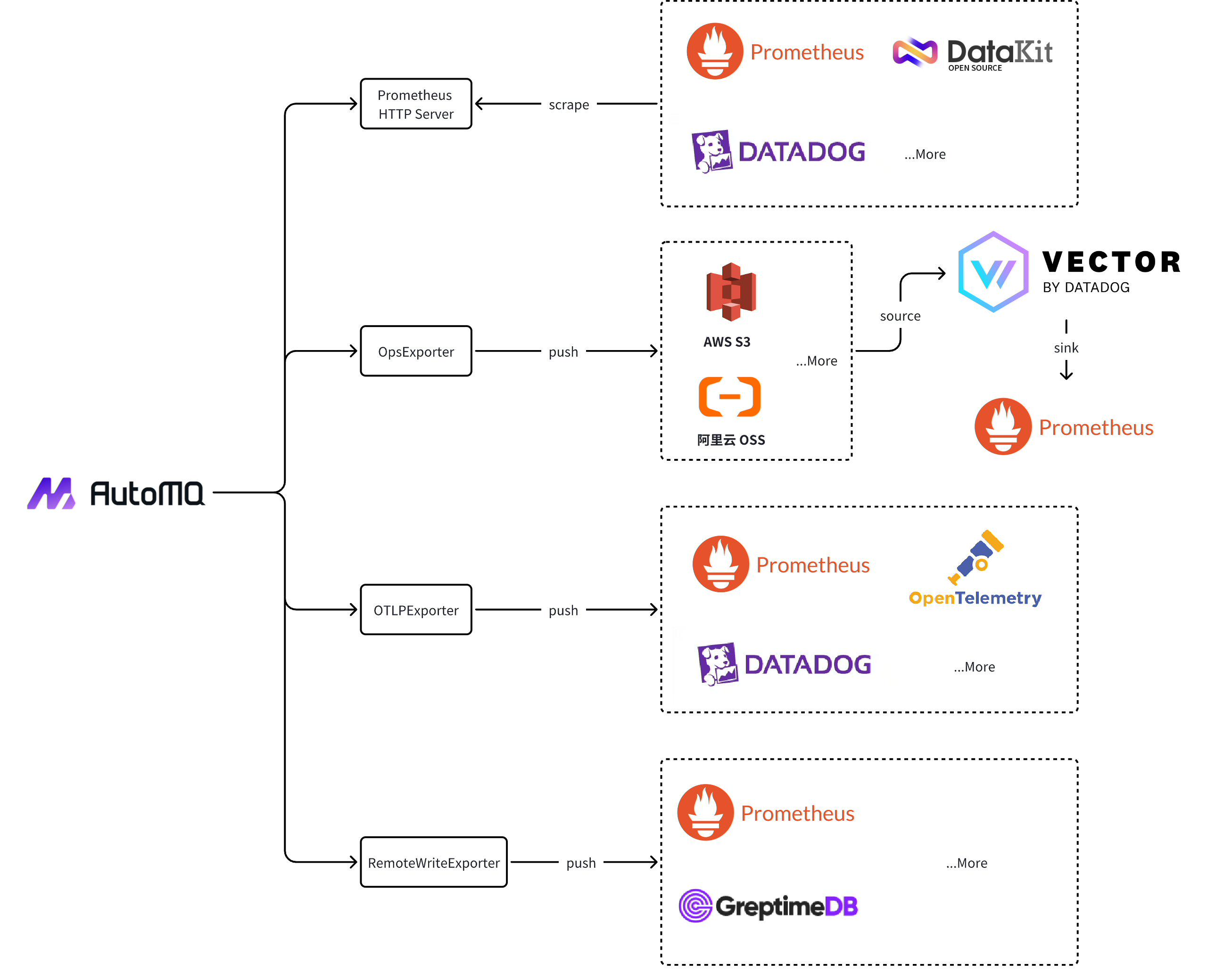 RemoteWriteExporter: A reporting component provided in the Business Edition of AutoMQ, it supports direct writing to backend storage compatible with the Prometheus Remote Write protocol, allowing integration with most Prometheus-compatible backends without deploying additional components.