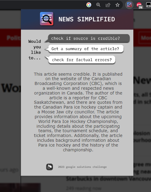 News Simplified is a Chrome extension that combats the spread of misinformation, and simplifies the process of reading news.