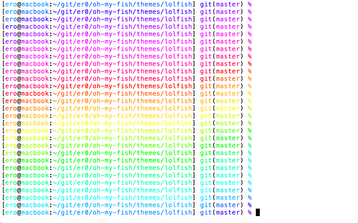 A fish (shell) theme with a poptart cat and a rainbow that signifies git status.