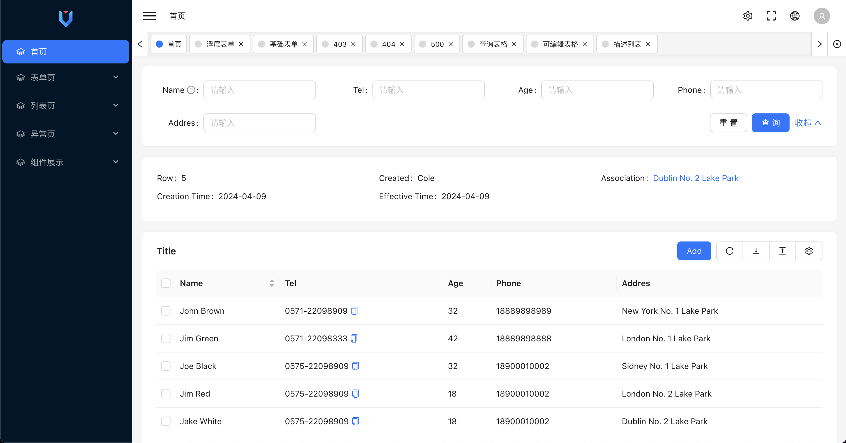 - 其他内置:主题切换、多语言、动态菜单栏、面包屑、全屏等