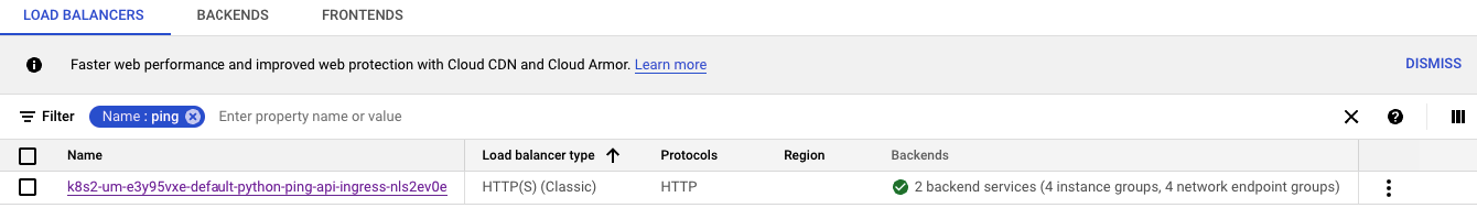 kubectl apply -f python-ping-api.yamlIt may take around 5 minutes to create a load balancer, including health checking.