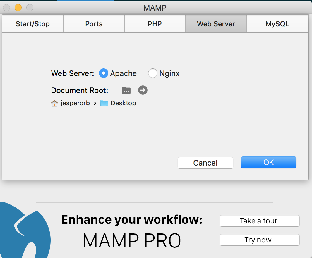 För att ändra varifrån du serverar dina filer med MAMP kan du i programmet gå till Preferences > Web Server > Document Root: sedan klicka på den lilla mappen: . Sedan kan du välja var du har dina webbprojekt.