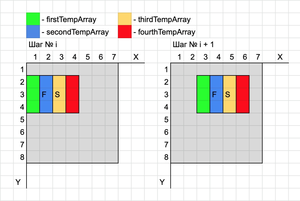На следующем шаге сдвинемся на 2 позиции право. Будем искать медианы пикселей (4, y) и (5, y). Заметим, что новые "зеленый" и "синий" массивы пикселей соответствуют thirdTempArray и fourthTempArray из предыдущего шага. Эти два массива остались отсортированными после предыдущего шага. Тогда сделаем swap(firstTempArray, thirdTempArray), swap(secondTempArray, fourthTempArray), заполним thirdTempArray пикселями (5, y - 1) - (5, y + 1), fourthTempArray пикселями (6, y - 1) - (6, y + 1) и вернемся к пункту 1.