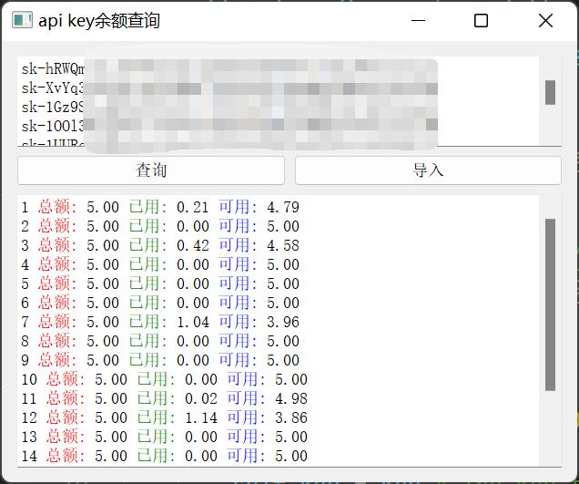 OpenAI_API_Usage_Python 使用pyqt5批量查询OpenAI API 使用情况 使用前需安装pyqt5, requests pip install pyqt5 requests 使用方法 方法一: 本地编译运行,在文本框中输入API key,用回车分隔多个key,点击查询 方法二: 本地编译运行,点击导入,即可导入文本文档中的key。文本中的多个key同样需使用回车进行分隔 默认导入同目录下的key.txt文件 注: 受限地区无法访问api.openai.com,请根据您自身情况使用代理或尝试其他办法