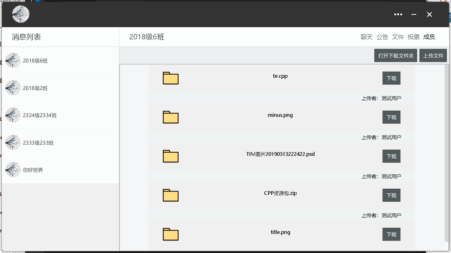 基于局域网的班级管理系统 这是SDU软件学院2018级的Java课设。 本质上是一个mini版QQ,所以我在做的时候界面参考了TIM。 功能 低多边形控件 登录功能 注册功能 文件传输功能 1对1聊天、班级聊天(群聊) 公告功能 投票功能(老师的要求是随机传递,我跟老师讨论了一下改成了实时,投票为同意和不同意两个选项) 简单的基于Markdown的编辑器 截图 BUG 目前有一些已知的小bug,我会在以后的更新中修复。