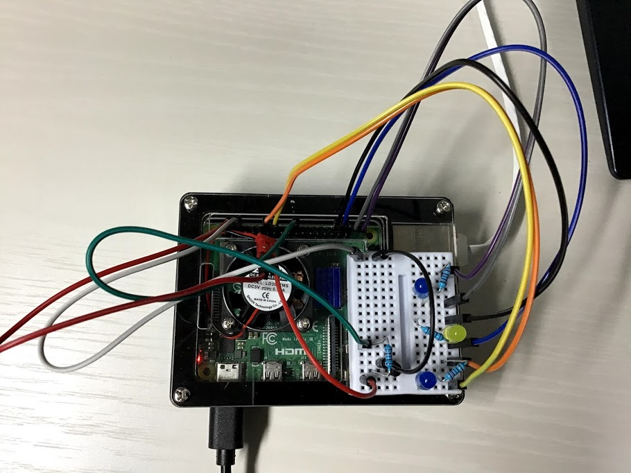 トランジスタのベースをGPIO25(緑ケーブル),LEDをそれぞれGPIO16(青ケーブル),GPIO23(黄ケーブル),GPIO26(灰ケーブル)に接続しています.