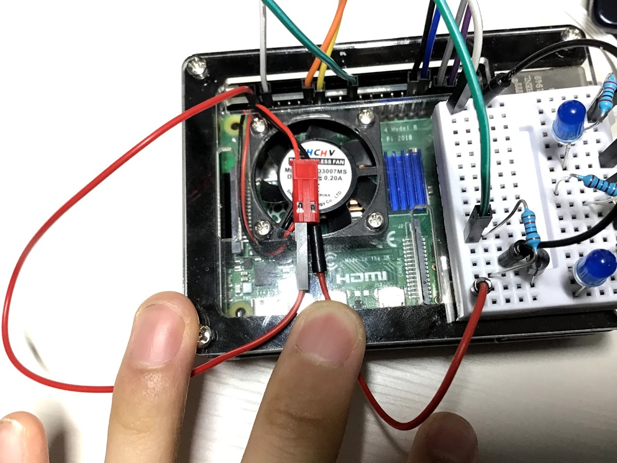 わかりにくいですが,冷却ファンの回路は5.0Vピン(赤ケーブル)からエミッタに接続し,コレクタをGND(白ケーブル)に接続しています.