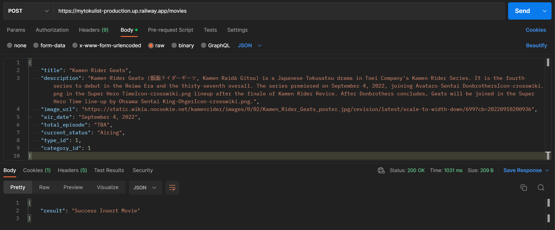 Perlu diperhatikan, method PUT pada endpoint di atas membutuhkan semua atribut movies kecuali category_id dan types_id, sebaliknya, method PATCH hanya membutuhkan atribut category_id dan types_id. Hal ini dikarenakan method PATCH dimaksudkan untuk meng-attach / update category dan types saja pada movies