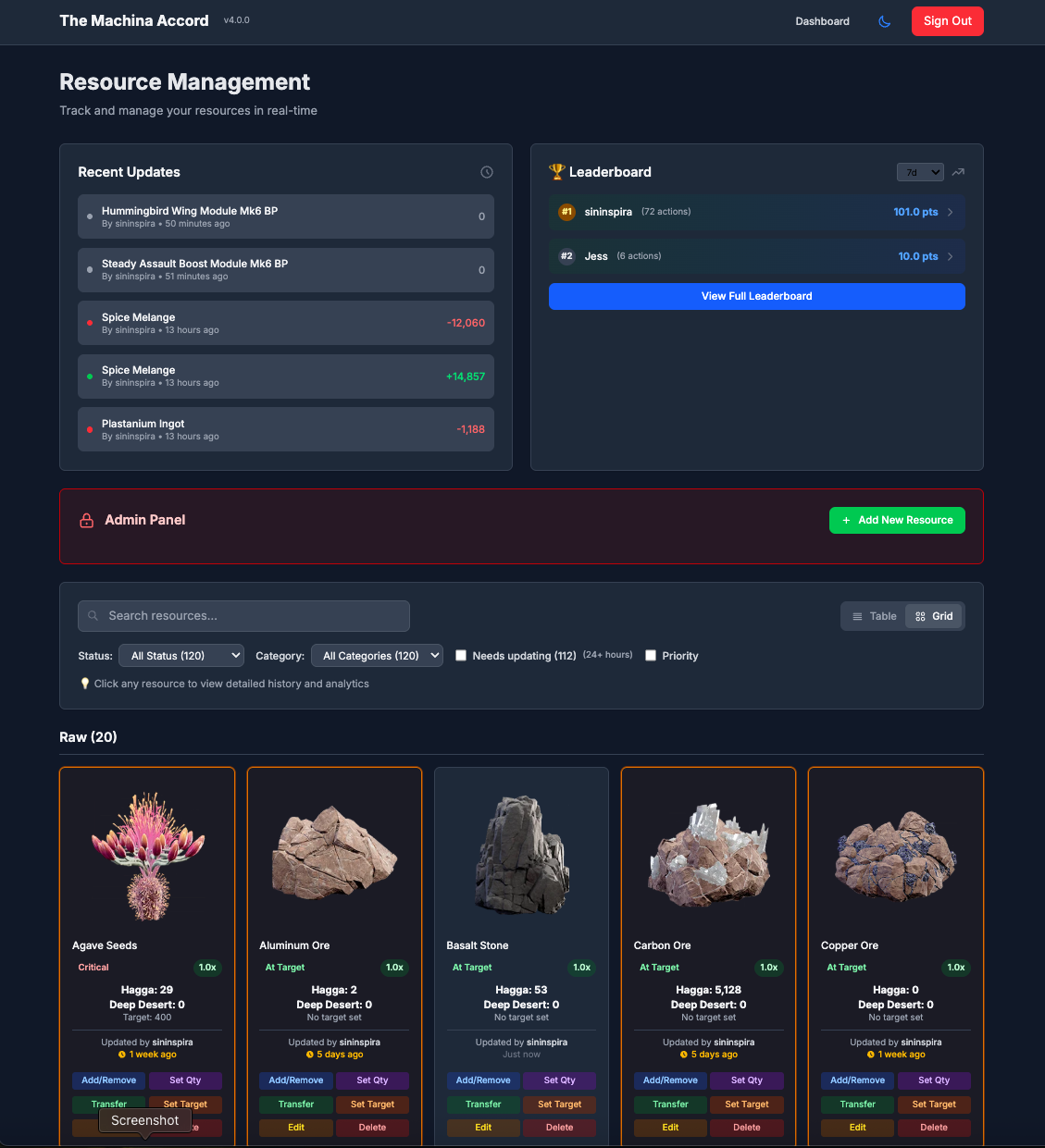 A comprehensive resource management and tracking portal with Discord authentication and role-based access control. Perfect for gaming communities, organizations, and teams that need to track shared resources, inventory, or assets.