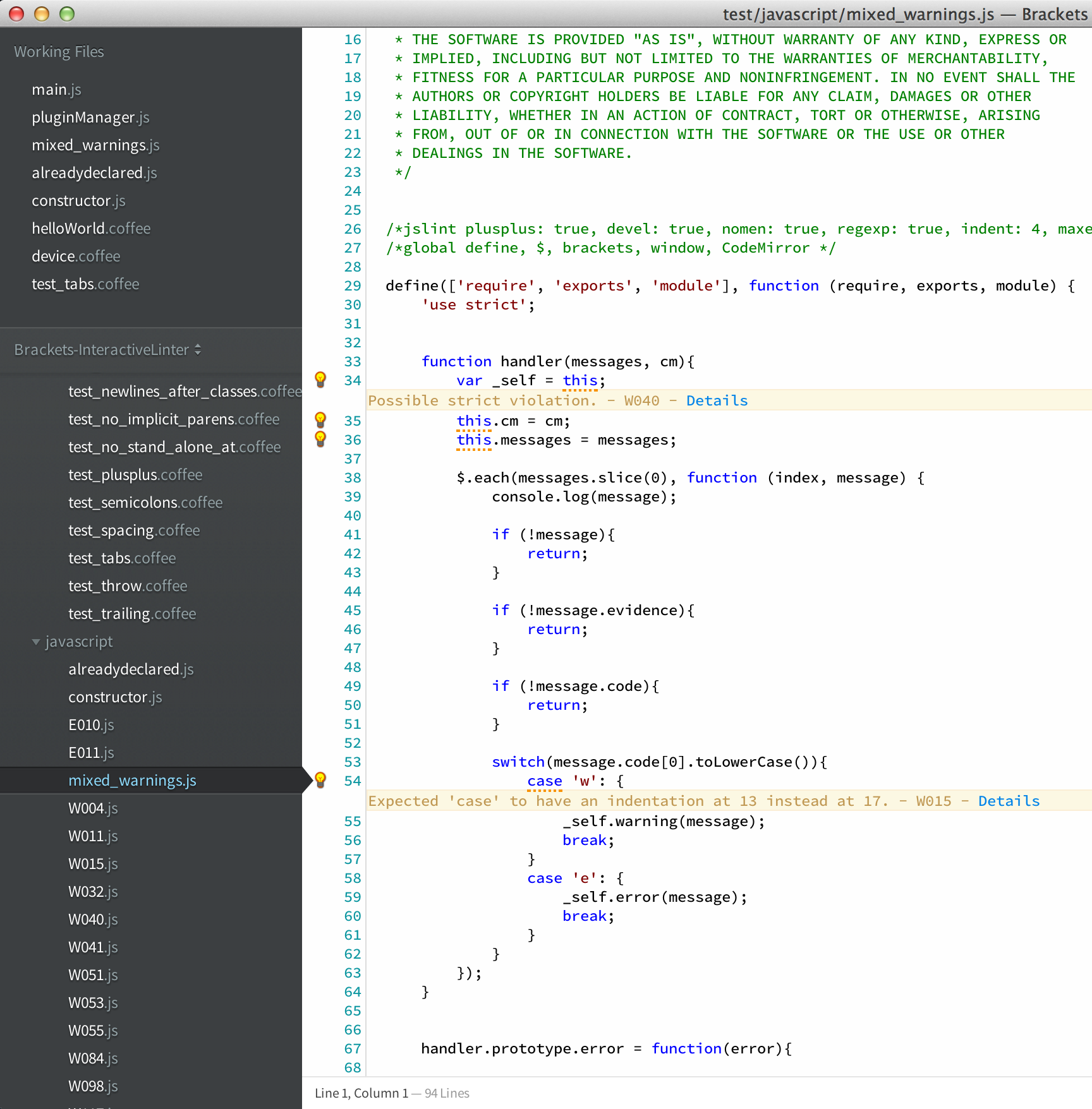 Brackets integration with linters such as JSHint, JSLint, ESLint, JSCS, CoffeeLint, and more! Interactive Linter runs linters as you work on your code and gives instant feedback right on your document. You can access the details of the lint report by clicking on the light bulbs on the line gutters to the right of the document, or by using the keyboard shortcut Ctrl-Shift-E