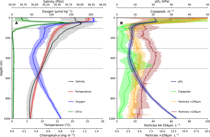 + "We can plot physical (temperature, salinity) or biogeochemical data (oxygen, chlorophyll, primary production, phytoplankton, nutrients, pH) as measured by the VirtualShip `CTD` and `CTD_BGC` instruments, respectively.\n",