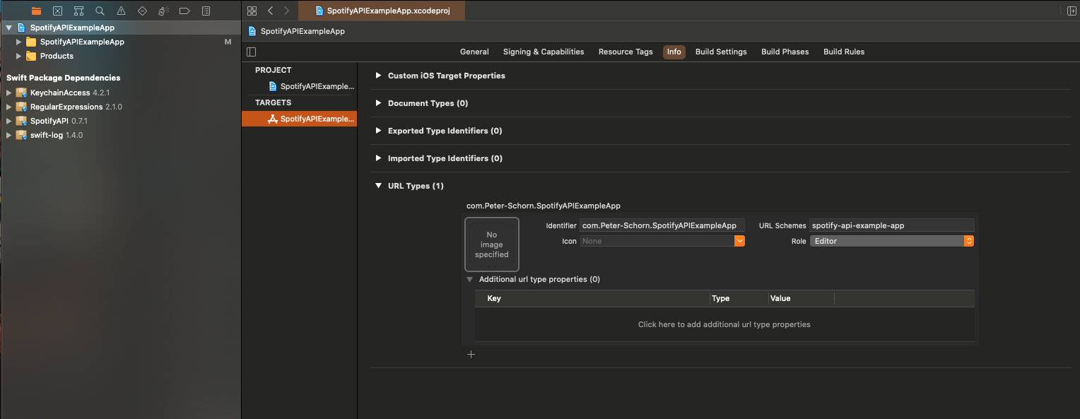 The first step in setting up the authorization process for an app like this is to register a URL scheme for your app. To do this, navigate to the Info tab of the target inside your project and add a URL scheme to the URL Types section. For this app, the scheme spotify-api-example-app