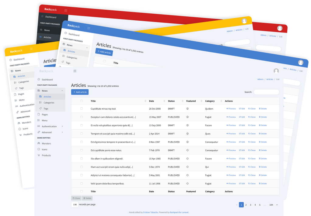 Quickly build an admin interface for your Eloquent models. Then customize every little detail. Among its features: