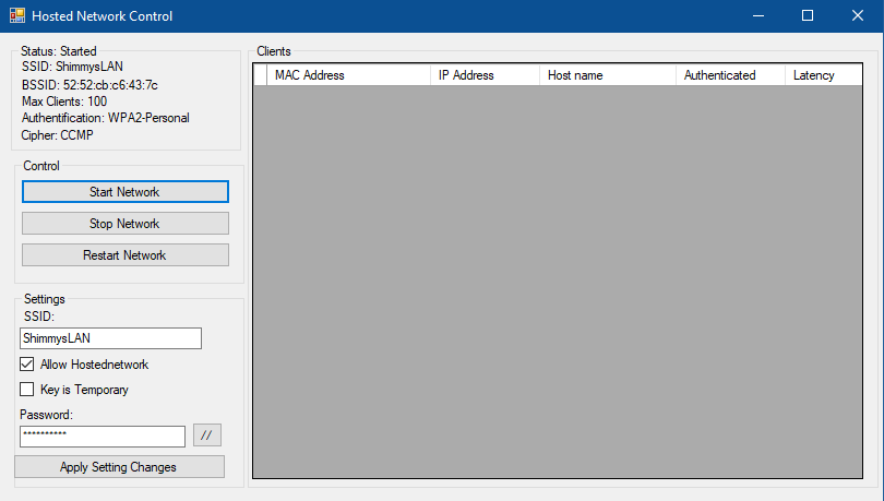 Acts like a GUI wrapper for the windows netsh.exe utility for hosted LANs.