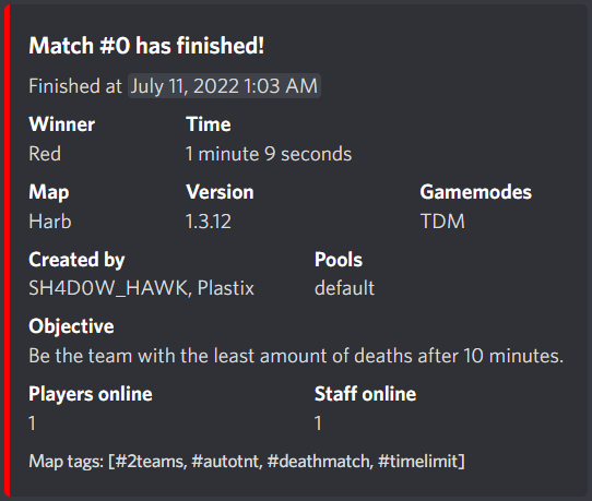 MatchBot will listen to MatchStartEvent and MatchFinishEvent to populate a Discord embed with information about a started or finished match.