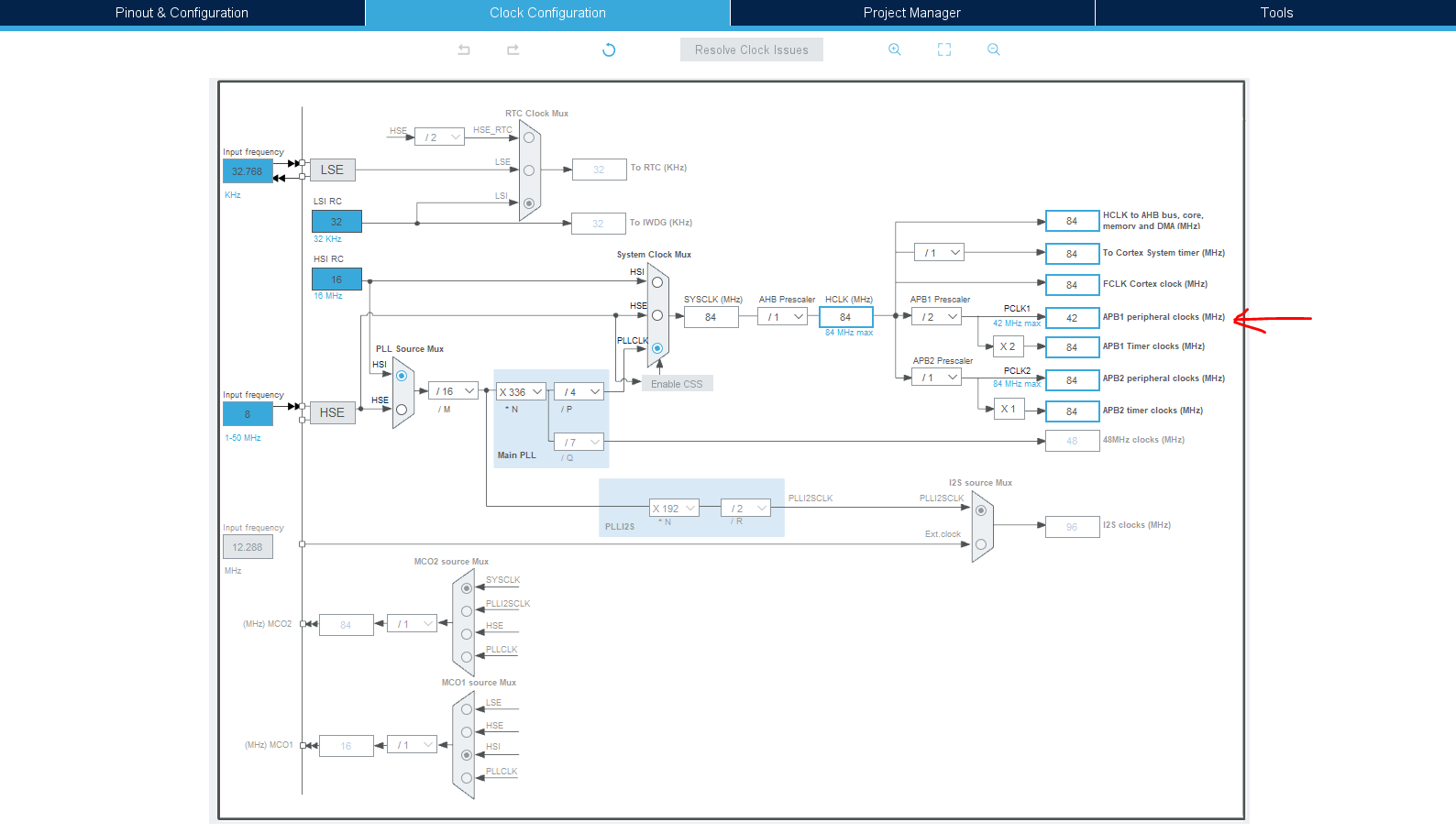 Then, we can go to the STM32CubeIDE and check which frequency is configured for the APB2. We can see that is configured with 42 MHz.