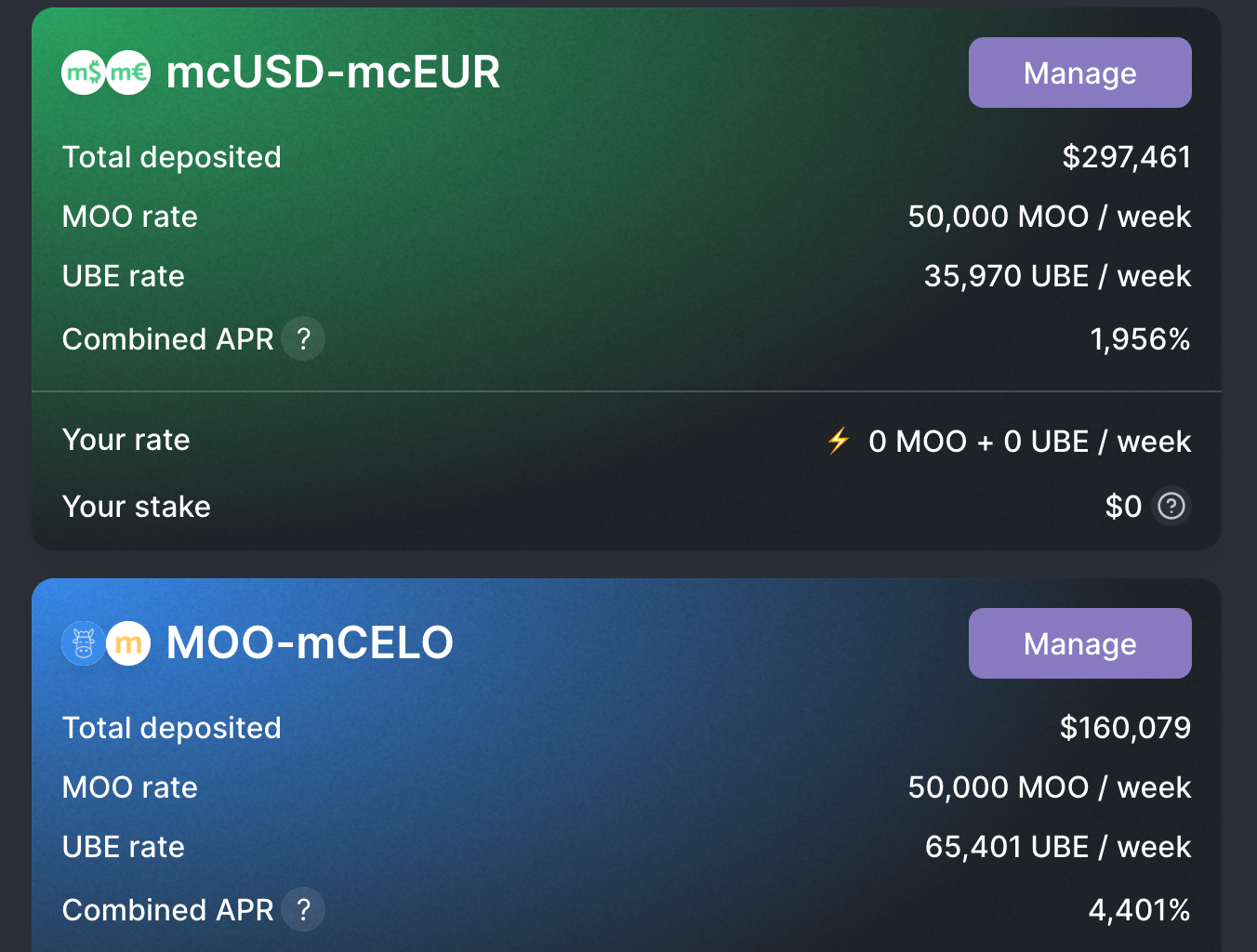 APRs and MOO distributions on old mcUSD-mcEUR and MOO-mCELO pools are wrong. APRs are very high and MOO distributions should be 0 ever since triple staking pools were activated. The high APRs are in error making users feel like they should keep their funds in a now defunct staking pool
