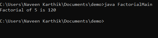 System.out.println("Factorial of 5 is " + f.calcFactorial(5));