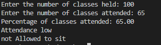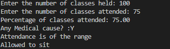 System.out.println("THe student is allowed to sit in the exam");