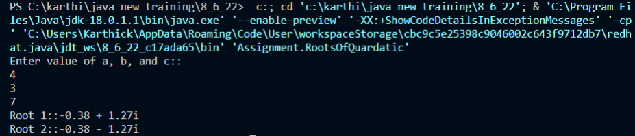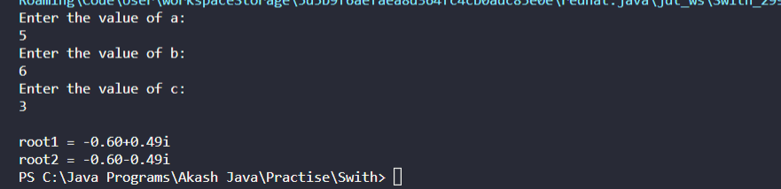 System.out.printf("Root1: %.4f + %.4fi \nRoot2: %.4f - %.4fi", r1, i, r2, i);