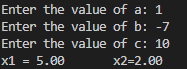 double a,b,c,x1,x2;