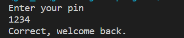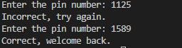 You have to design the code such that the user has only three tries to guess the correct pin of the account. You set the pin as a constant with a final attribute. When correct display “Correct, welcome back.” When incorrect display “Incorrect, try again.”. When ran out of tries display “Sorry but you have been locked out.”