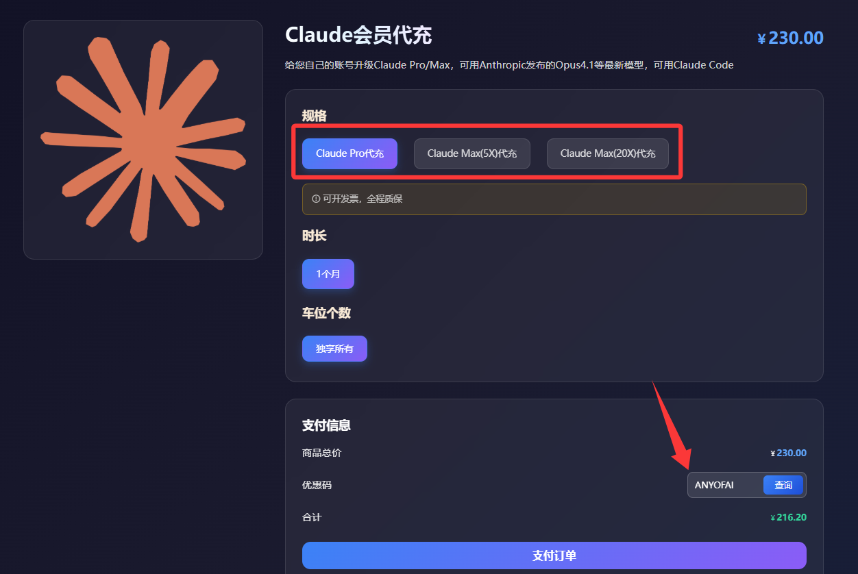 如果你还没有注册Claude账号,并且想使用Claude Pro会员,那么在选择了"Claude Pro账号购买"服务之后,也记得使用优惠码"ANYOFAI"(可享九折优惠),然后点击"支付订单"按钮,并按照系统提示完成支付。当你完成付款后,星际放映厅就会直接为你提供一个已完成订阅充值的Claude Pro原生独立账号,你拿过来就可以直接使用,没有任何限制。