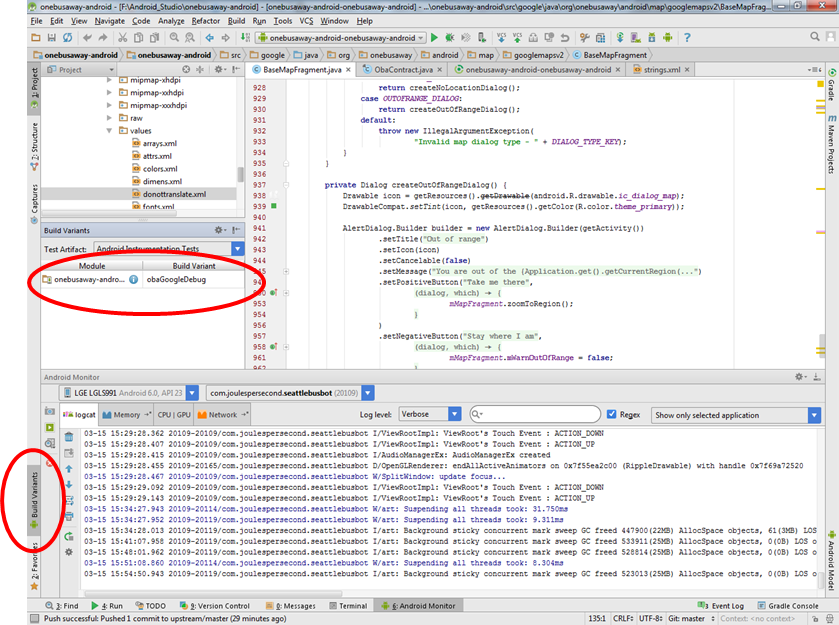 - Open the "Build Variants" window (it appears as a vertical button on left side of workspace by default) & choose obaGoogleDebug to select the Google Play version, or obaAmazonDebug to select the Fire Phone.
