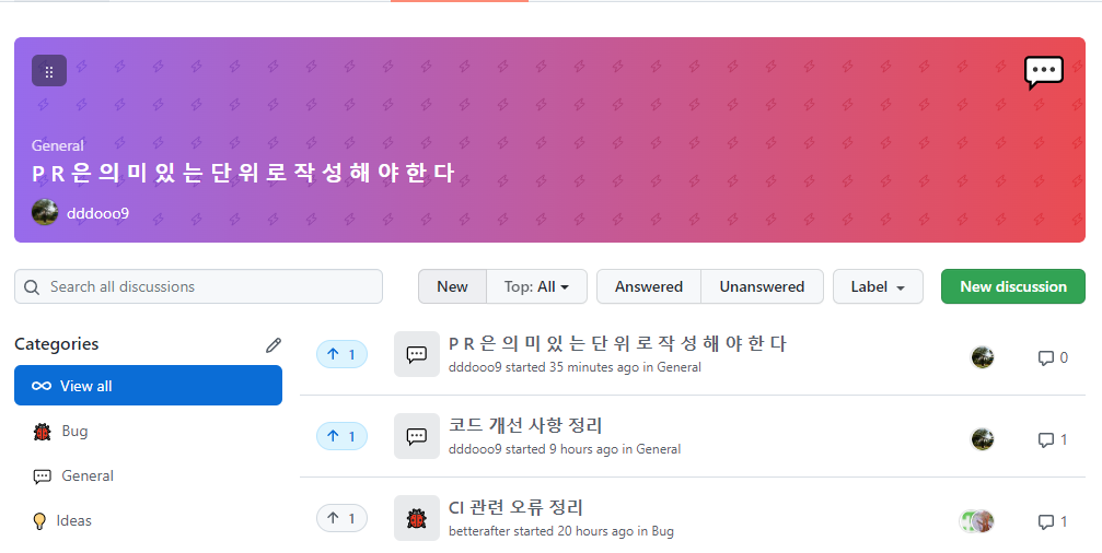 버그는 Create issue from discussion 이슈로 추가해서 관리