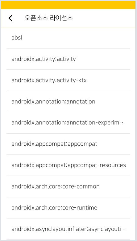 build.gradle에 의존성을 추가하고 OssLicenseMenuActivity를 실행하면 라이브러리 목록을 확인할 수 있다.