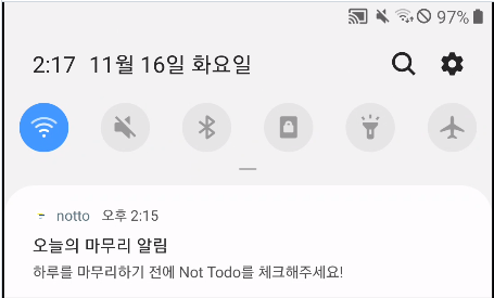 - 11시 경에 "오늘 확인하지 못한 Not Todo를 확인해보라"는 푸시 알림을 띄워줌