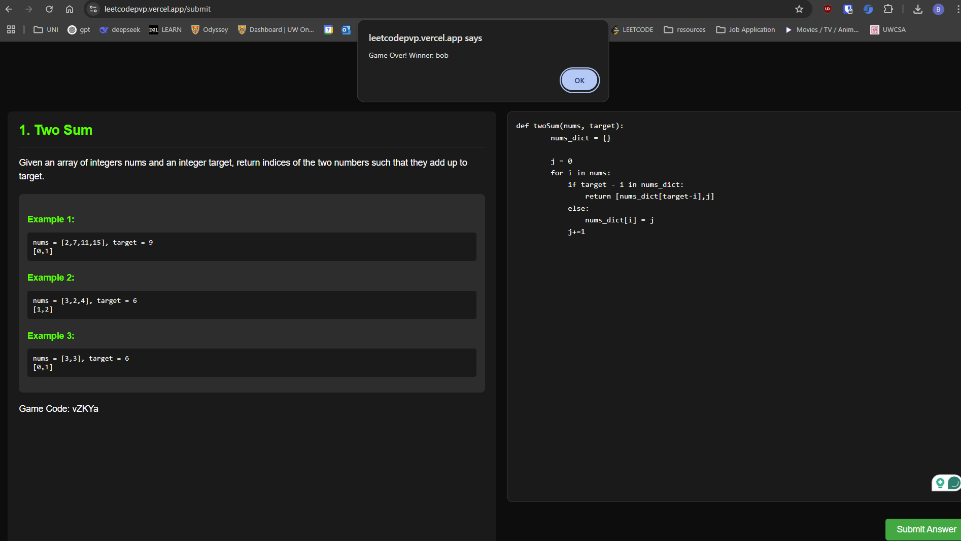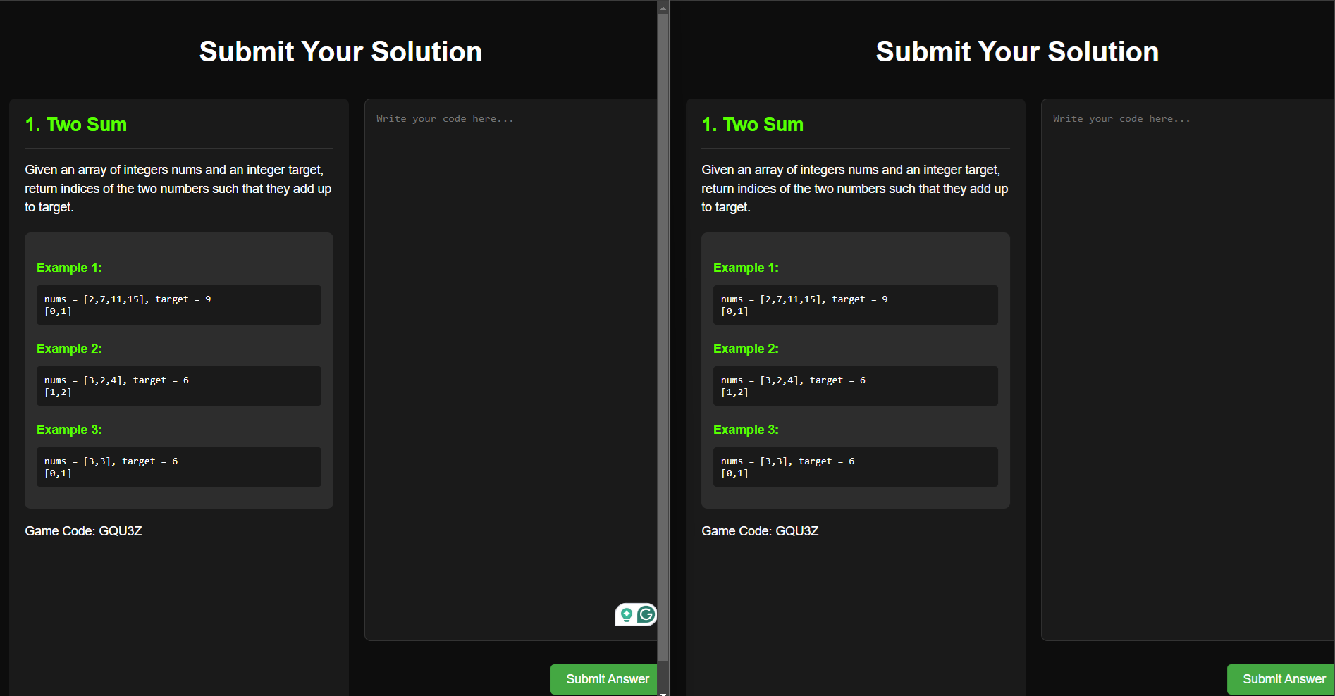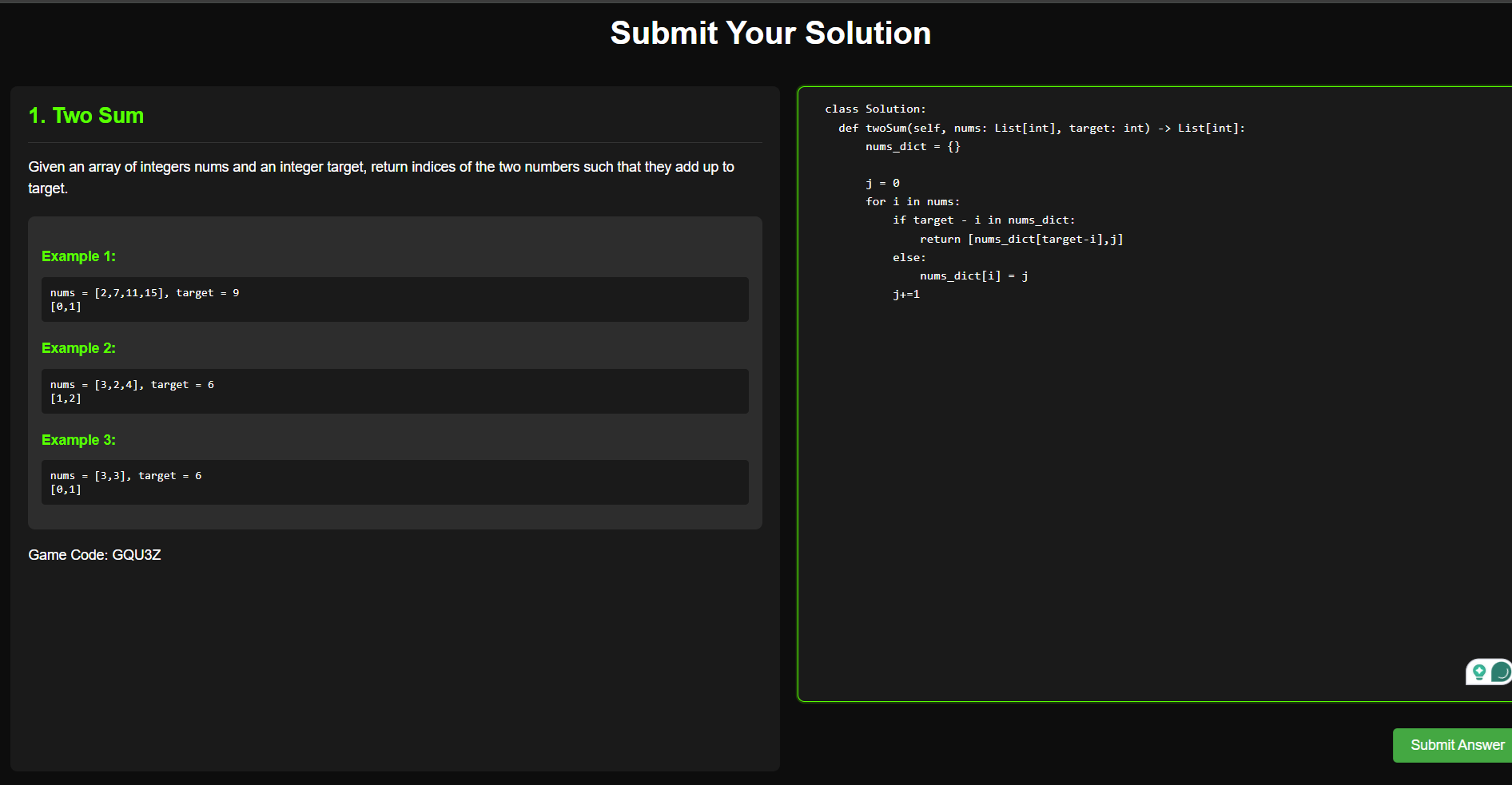 Introducting LeetcodePVP, a full-stack web application built to allow users to compete against their friends in Leetcode problems. It features real-time competition, problem solving tracking, and a winner loser competitive format to gamify practicing Leetcode Problems.