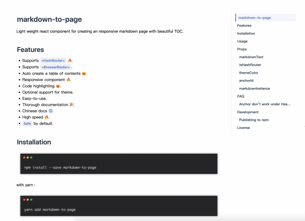 Light weight react component for creating a responsive markdown page with beautiful TOC.