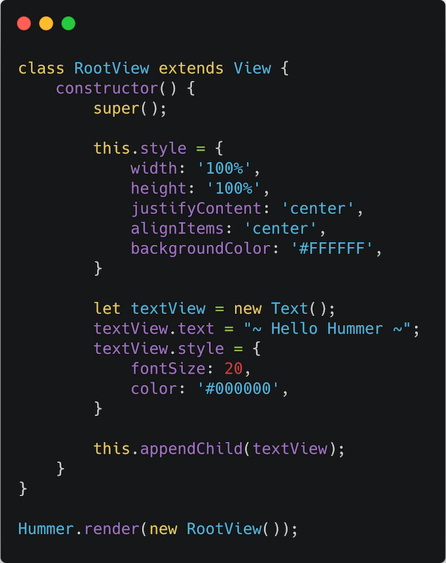 简单感受一下分别使用 Hummer API 和 Tenon 开发的 HelloWorld 页面对应的代码,以及分别在 Android 和 iOS 设备上运行的最终效果。