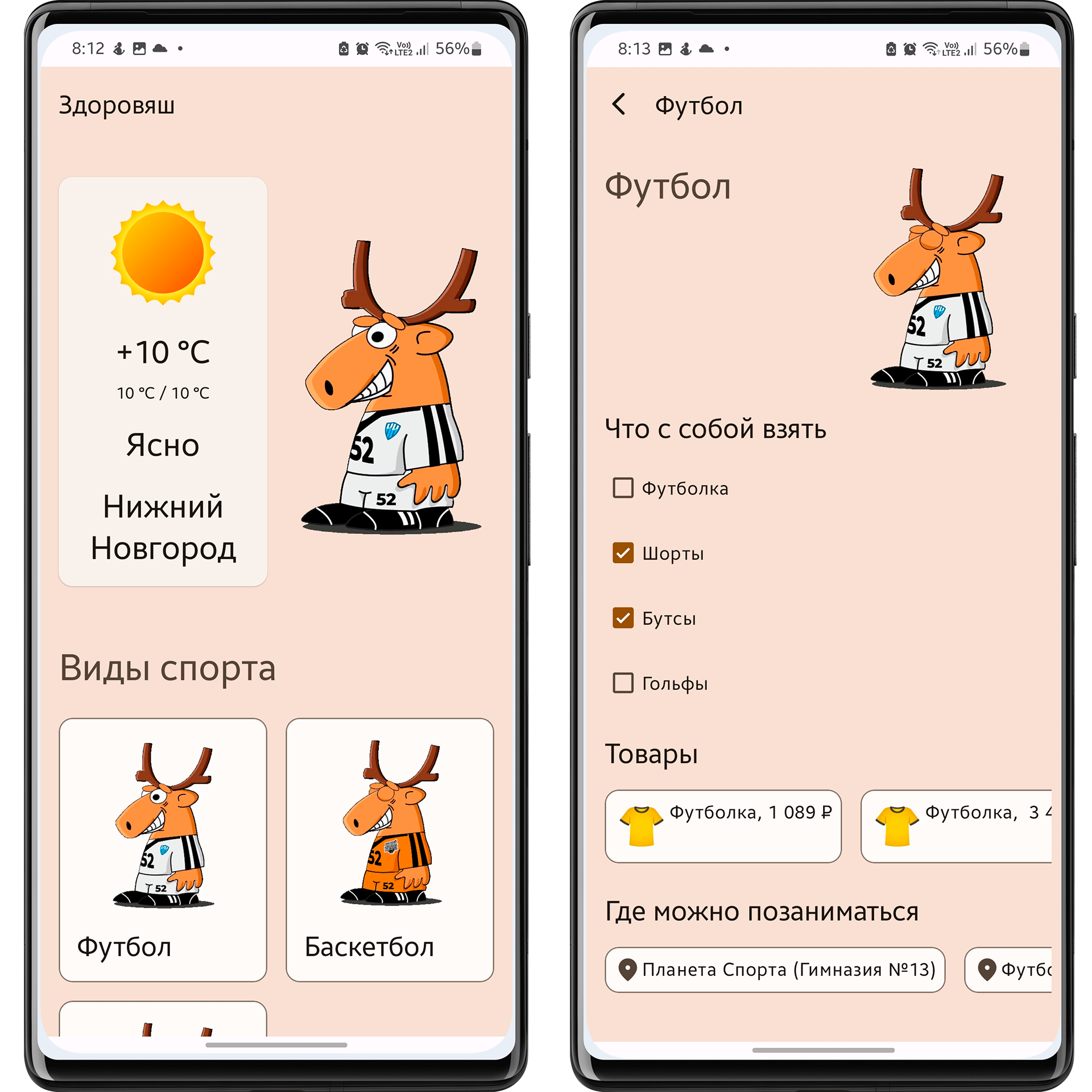 Приложение "Здоровяш" на вашем телефоне подскажет, какую экипировку вам надеть, исходя из погодных условий за окном, вида вашего спорта и вашего уровня мастерства в нем. А если подходящей экипировки у вас нет, то посоветует магазины где ее можно просто и быстро приобрести!