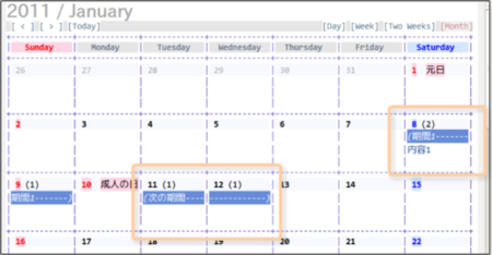 • 2011/10/10 ver 1.3 : Improved visual and navigation: multi-line, moving items in a day, diary mode and so on.