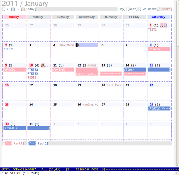 Schedule data which are shown in the calendar view, are collected by a list of the struct cfw:source objects through the named argument variables :contents-sources and :annotation-sources. The former source defines schedule contents. The later one does date annotations like the moon phases.