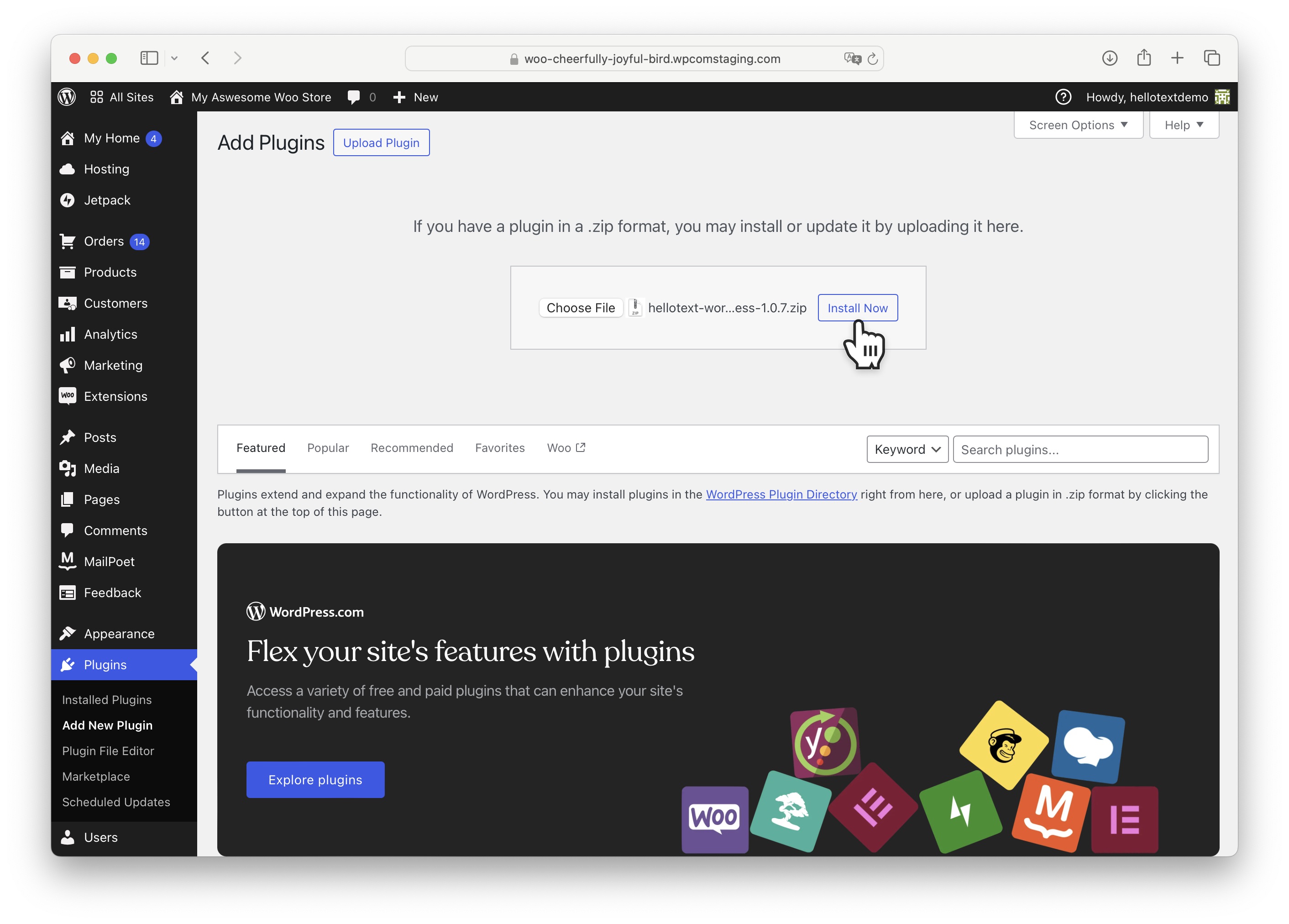 Click the button to choose the Hellotext plugin you downloaded in .zip format from your files.