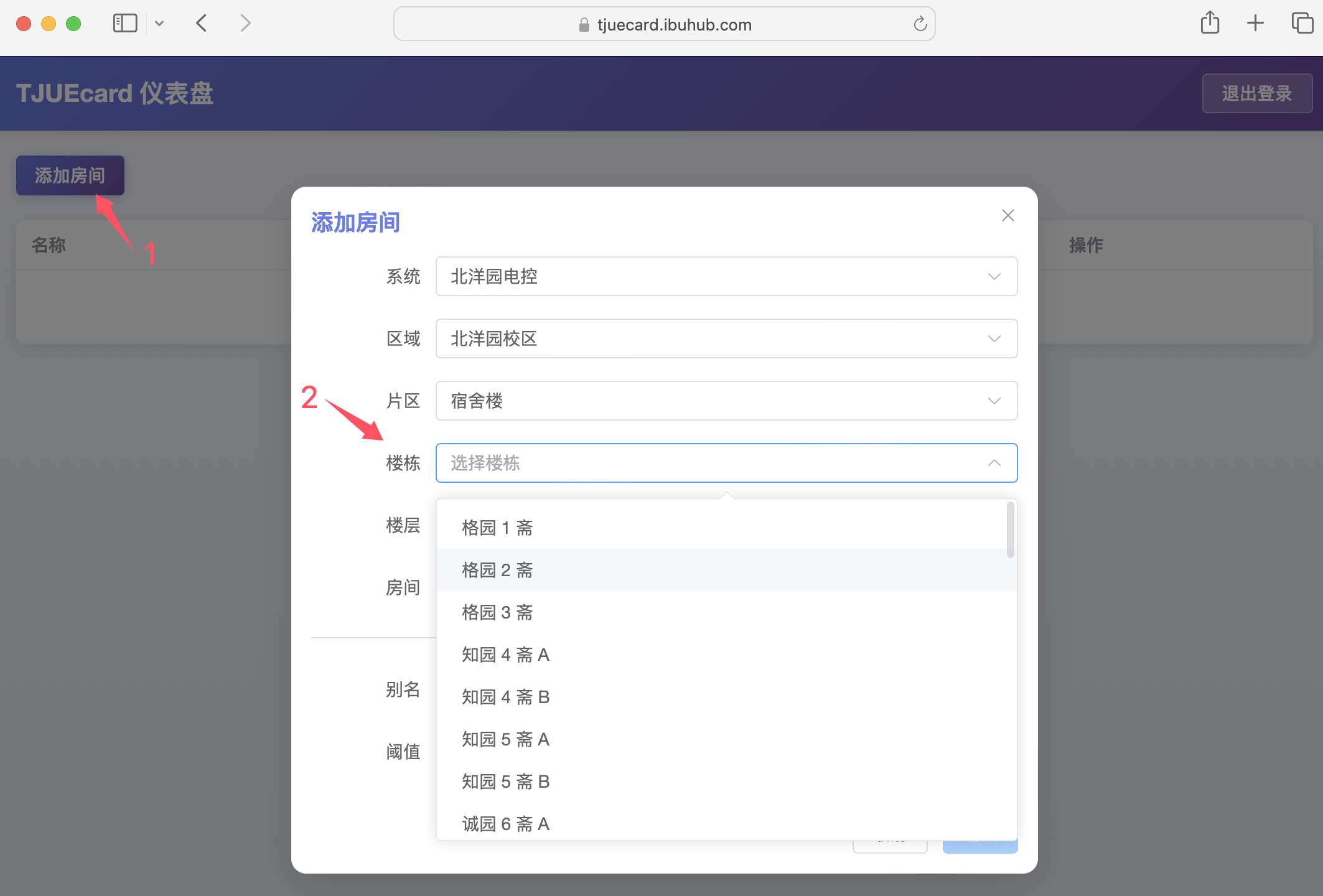 添加房间 登录后进入仪表盘,点击「添加房间」按钮。您需要提供房间的详细信息(如校区、楼栋、房间号)以便系统进行绑定。