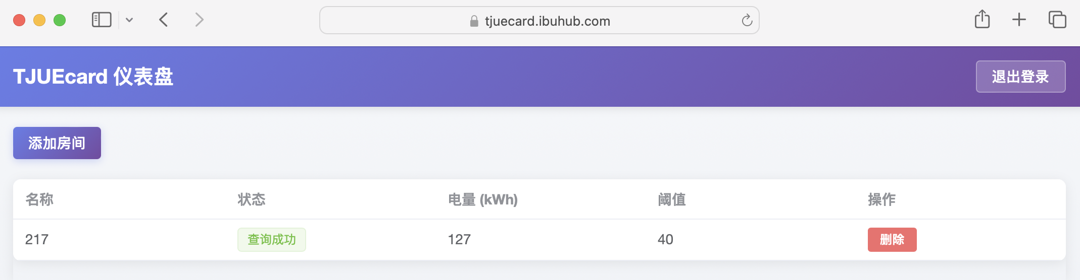 设置阈值 在房间列表中,您可以为每个房间设定「电费报警阈值」,我们的 Agent 会定期查询电费。当查询到的剩余电量低于该值时,系统将会向您注册的邮箱发送提醒通知。