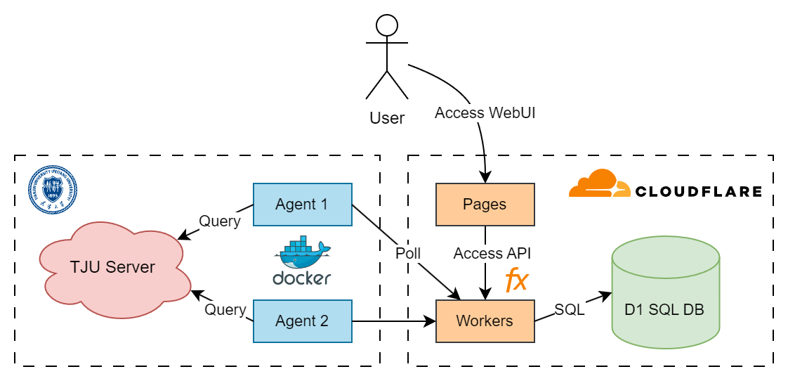 🐋 Agent 代理:运行于 Docker 容器中的 Python 进程,部署在校园网内,定期向后端轮询待查询任务,模拟登录天津大学能源管理系统获取电费数据,并将结果回传至后端。目前,我们部署了多个 Agent 实例,以确保高可用性。