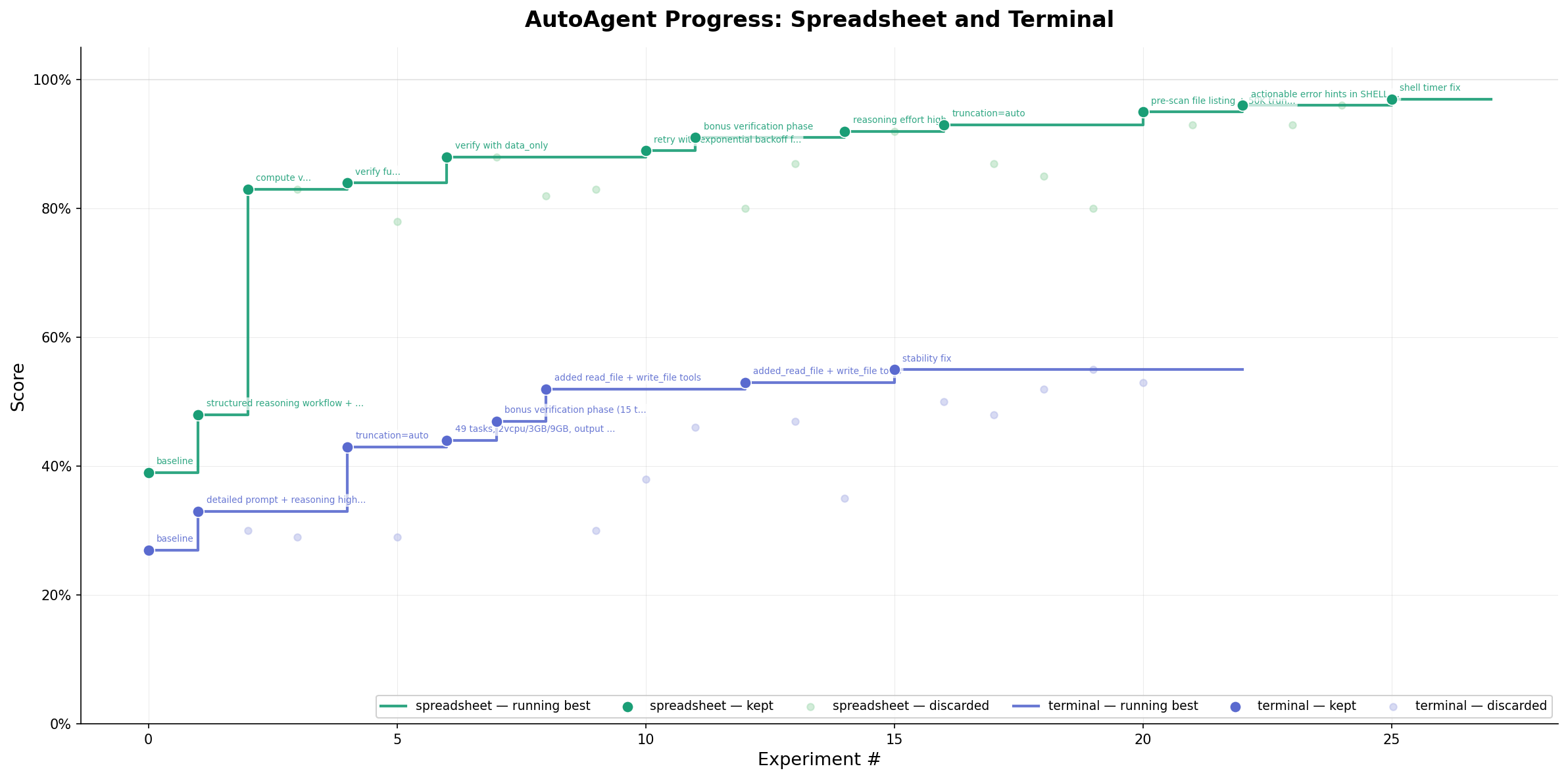 Autonomous agent engineering worker on iii-engine. A meta-agent modifies an agent harness (system prompt, tools, orchestration), runs Harbor benchmarks, and the orchestrator auto-keeps or discards based on score. Adaptive search transitions between explore/exploit/combine/ablation. - 26 iii functions across 5 groups (experiment, task, search, harness, report) - 26 HTTP triggers for REST API at localhost:3111 - Adaptive search strategy with near-miss detection - Crash recovery with consecutive tracking and auto-abort - Per-task failure analysis and experiment diffing - Harness snapshots for instant save/restore - Multi-dataset progress chart generator (plot_progress.py) - 3 sample Harbor benchmark tasks (hello-world, fizzbuzz, file-organizer) - 50 integration tests, all passing Inspired by kevinrgu/autoagent, built from scratch on iii-engine primitives (same relationship as karpathy/autoresearch → n-autoresearch).