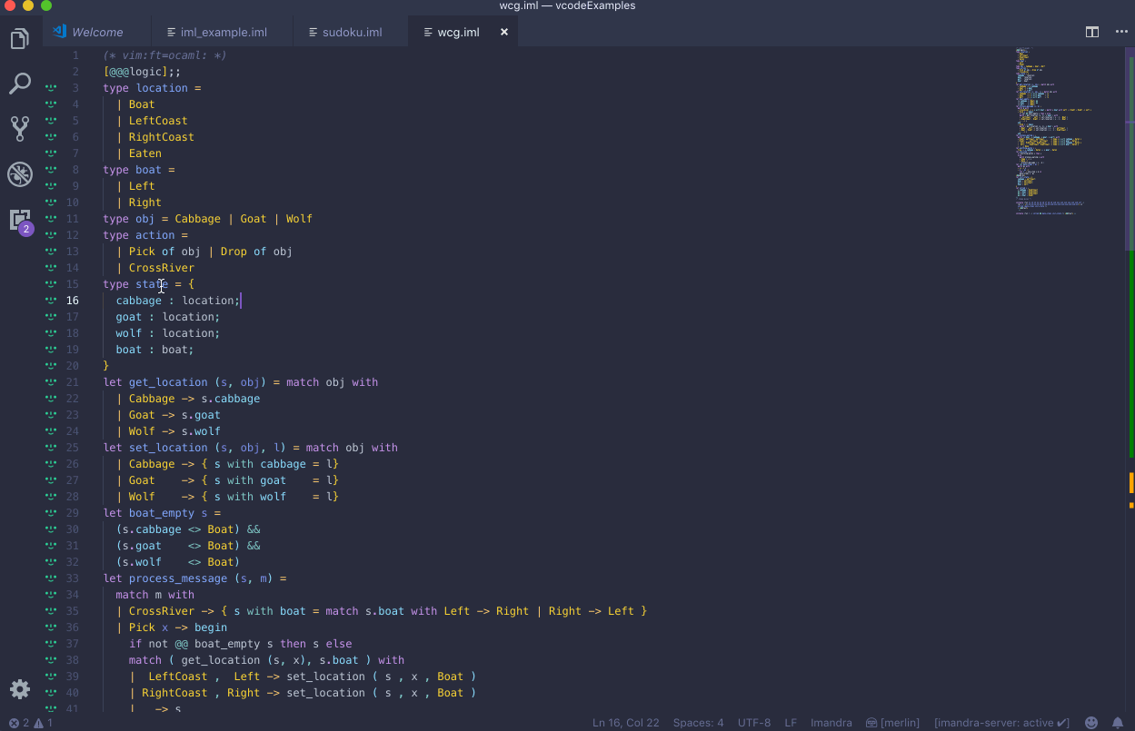The merlin integration for this VSCode extension builds on the existing excellent OCaml and Reason IDE for Reason and OCaml files. It provides a mirror of the environment variables for each of the possible commands, and code actions function exactly the same as from this repository. By default, merlin uses specific readers to analyse imandra and imandra-reason files.